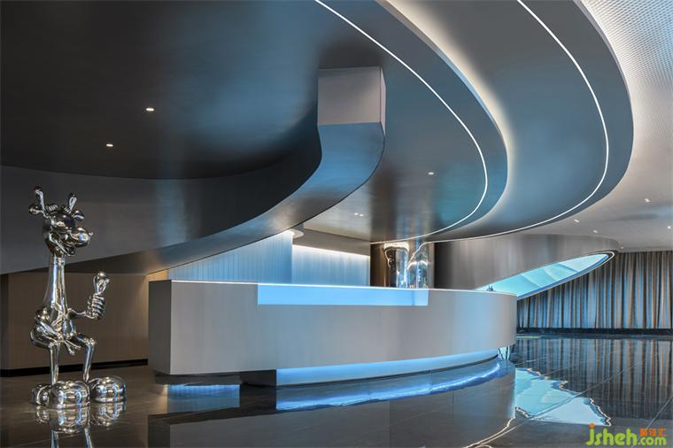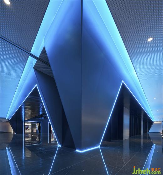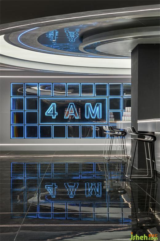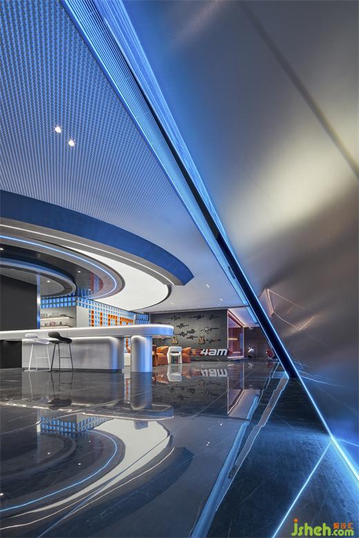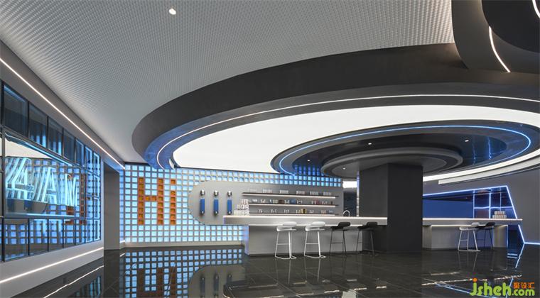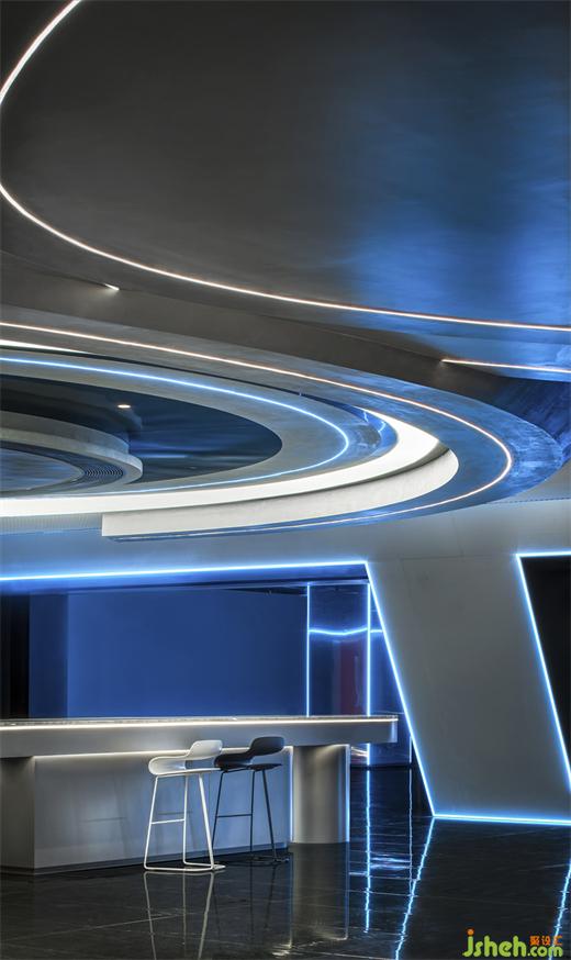 斜面的大型盒子如裝置一樣座立在空間上,電競俱樂部設(shè)計(jì)靛藍(lán)色的極光穿梭在空間之中,就像生活在未來的賽博朋克世界。