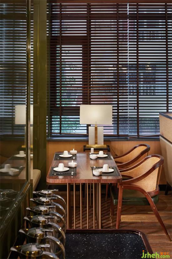 竹林茶室,成都餐廳設(shè)計整個空間用竹子造型,地面的青磚拼花、墻面的原木色木飾面以及綠色烤漆墻,配上竹椅,成都閑派的“閑”就立即體現(xiàn)出來了。
