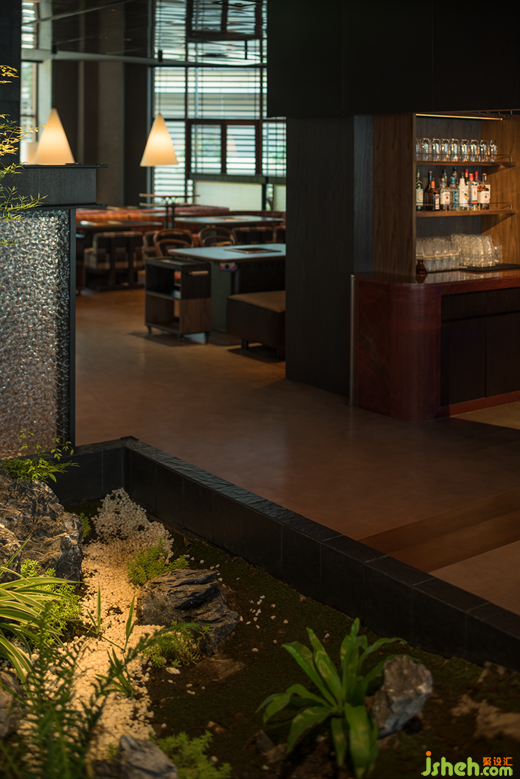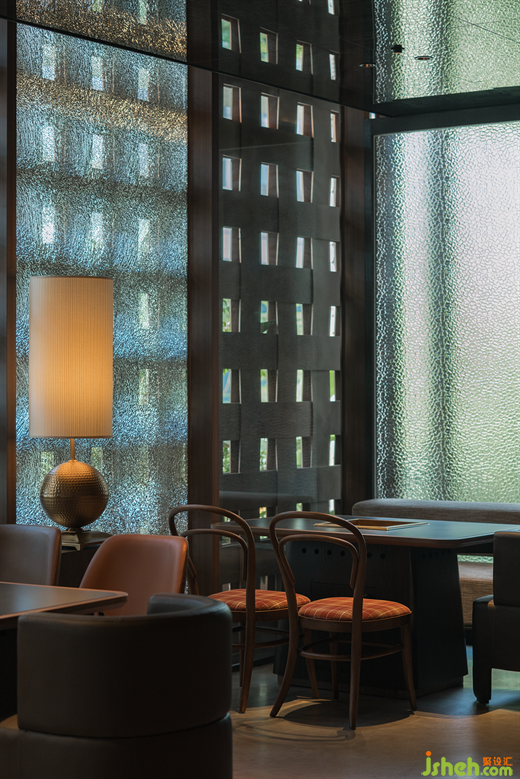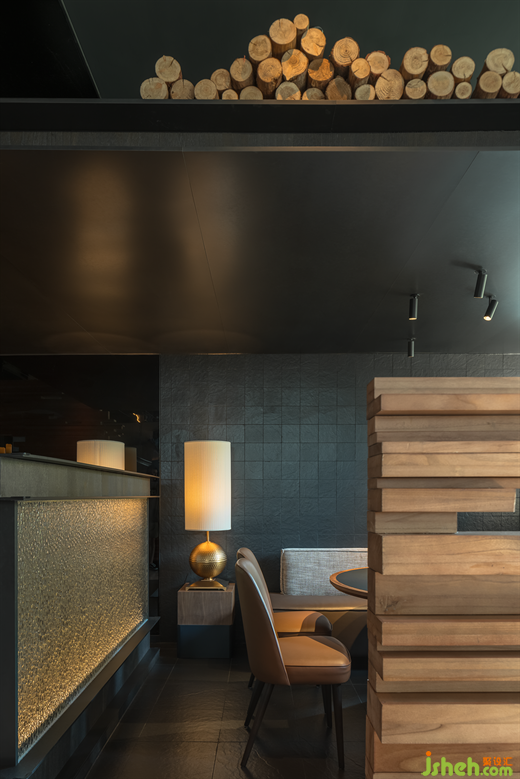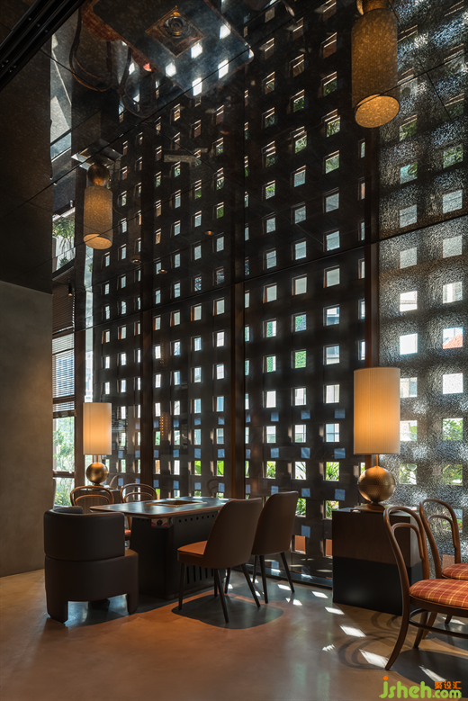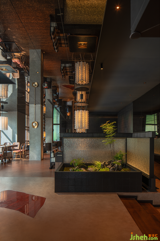 空間層次上的高低處理、多種透與不透、隔斷介質(zhì)的穿插, 火鍋店設(shè)計超常規(guī)尺度編制隔斷,仿佛捕夢網(wǎng),與紅色異形石材地拼、充滿肌理感堆積木料、秩序感陣列吊燈形成獨(dú)特的空間語言體系。類似電影的跳接剪輯、蒙太奇手法,這些手法的運(yùn)用讓空間帶有些許電影氣質(zhì),如夢如囈語的電影旁白般貫穿始終,滲透著設(shè)計師對“夢”的理解。
