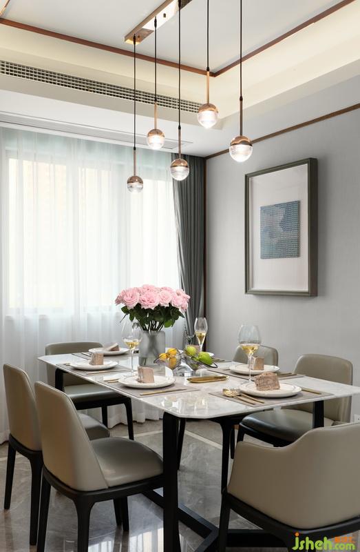 餐廳水晶燈選用了玫瑰金色,高低錯落,一字排開,抽象的立體畫,精致而不失格調(diào),荔枝玫瑰的芬芳淡淡彌漫在空氣中,三兩好友,家人小聚,美好不過如此…