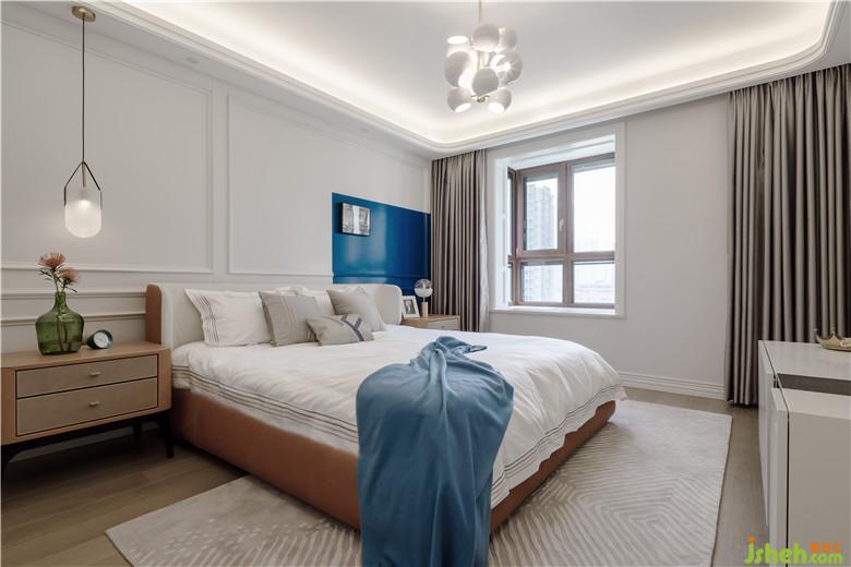 主臥,一半海水一半火焰,橘色與藍色,熱情與冷靜結合的天衣無縫。米咖色地毯立體感十足,與高光的深灰色窗簾遙相呼應。