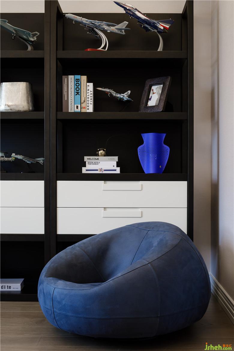 主臥背景,由簡單的線條方框而構成,只需把握好比例,加入不一樣的藍色基調,便能起到畫龍點睛的作用。原皮家具釋放出低調的溫暖,浸潤著這個空間…