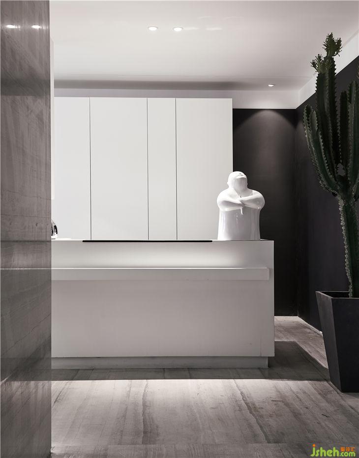 前臺是一直延伸至餐桌的大體塊,中間的隔板將兩個區(qū)域巧妙劃分,將空間的完整性、功能性發(fā)揮到極致。臺面上配以充滿趣味性的藝術品,理性與感性在此展現(xiàn),讓辦公空間有序又不單調(diào)。