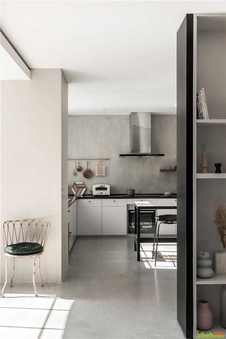 我們希望整個空間展現(xiàn)出純粹質(zhì)樸的味道,同時又具備足夠的自然氣息,在墻體一側(cè)留出一個空間,將木質(zhì)隔板與陶藝制品完美地結(jié)合,仿佛在空間中進行溫柔的對話。