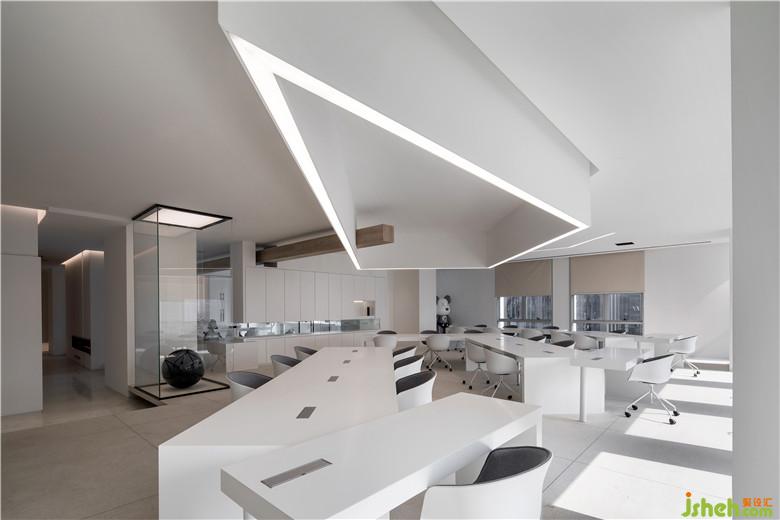 員工辦公區(qū)大面積采用了白色,線型的暖光燈為空間加強了結(jié)構(gòu)性,顯得更加自由。辦公桌沿著頂部燈的走向分布,呈現(xiàn)出有秩序的美感。