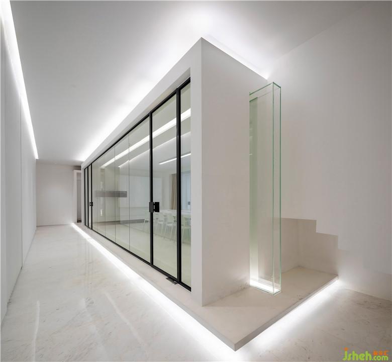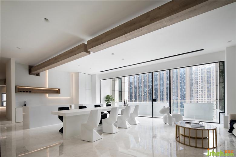 會(huì)議室門口的“大盒子”體塊中嵌入通透的玻璃體塊,讓空間顯得更加柔和與有趣。