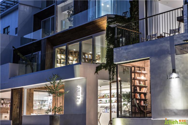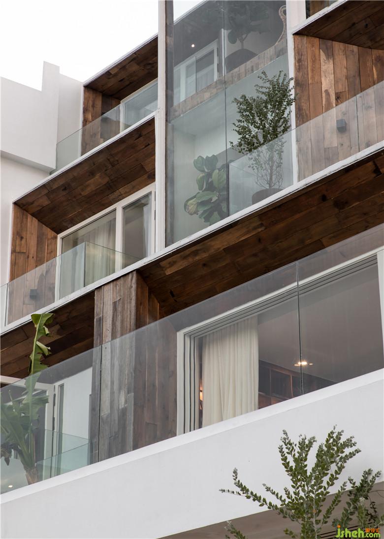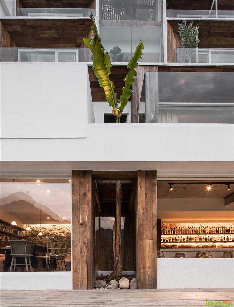 「駐·85」的建筑通體呈白色,結(jié)合江南傳統(tǒng)的“白墻黑瓦”的傳統(tǒng)進行創(chuàng)新,融合在當?shù)亟ㄖ褐?。設(shè)計師用一個個“木方塊”堆疊,讓建筑外立面變得擁有構(gòu)成感,并且做了層層內(nèi)退的處理,使用了木飾面與通透的玻璃材料為原本封閉的空間劃出了陽臺,為空間擴大了視野、加強層次感。