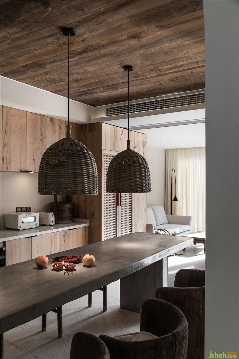 一層的公共區(qū)域劃分為廚房、閱讀區(qū)、以及沙發(fā)休息區(qū),空間整體色調(diào)充滿自然的樸素感,設(shè)計師希望來到這里能夠讓人們停下腳步,感受自然的氣息。