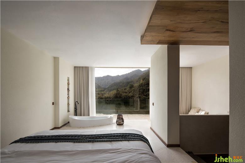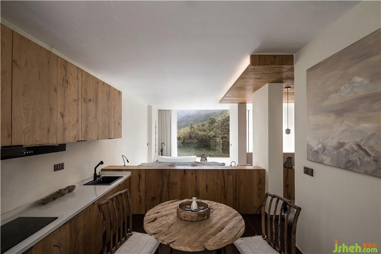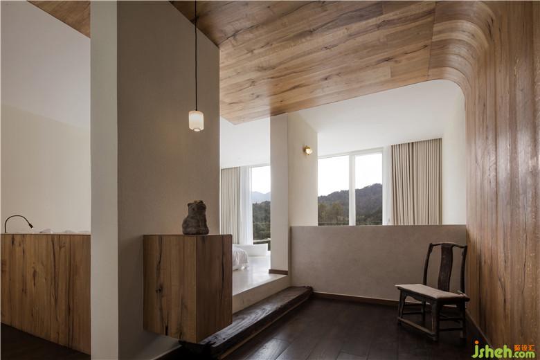 材質(zhì)上選用了暖色的涂料與木質(zhì)搭配,讓空間呈現(xiàn)出溫暖自然的格調(diào)。身處的空間變得純粹、寧靜,能夠讓人瞬間忘掉一切煩惱,盡情欣賞眼前的好山好水。