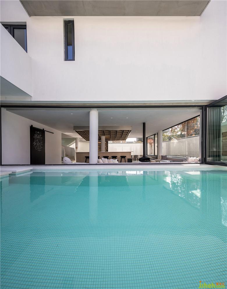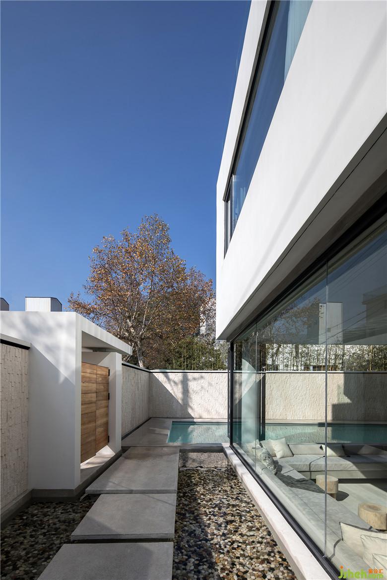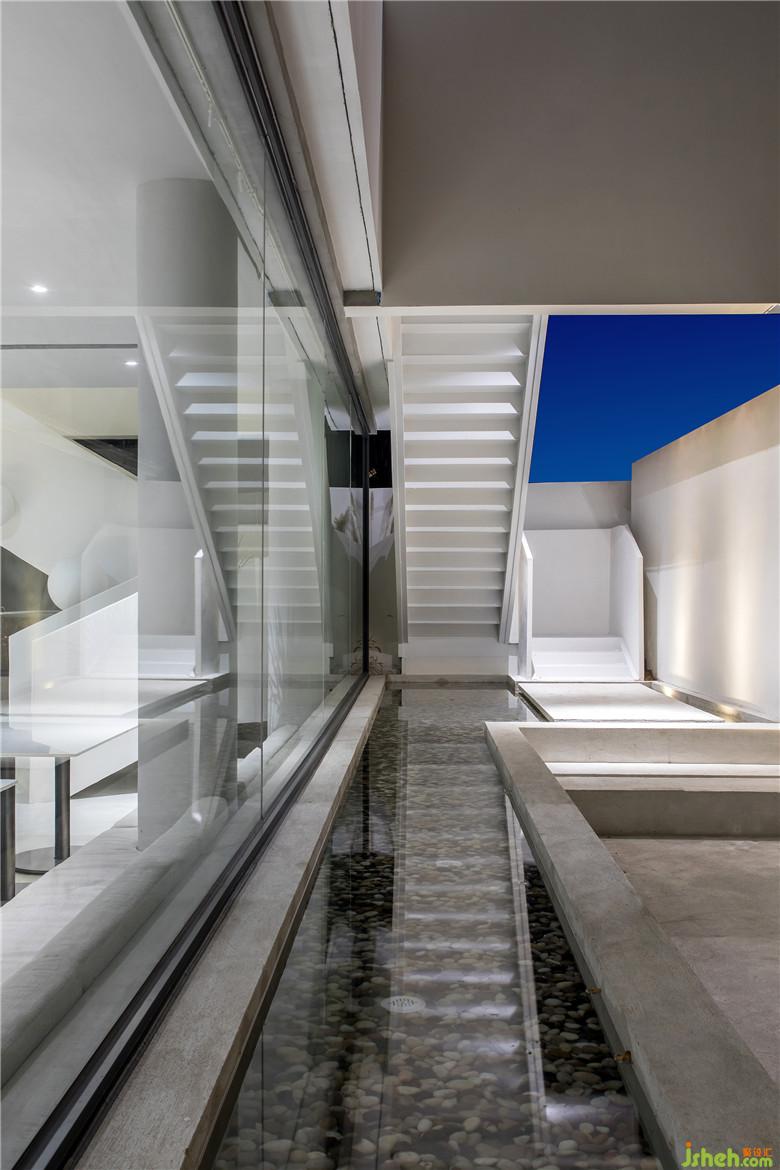 整個(gè)庭院被水系包圍,建筑就像是懸浮在水面中,從泳池到汀步走道以及圍墻中不斷流動的瀑布,互相流通循環(huán),設(shè)計(jì)師希望建筑能在水中無限生長,賦予生命與自然的力量。