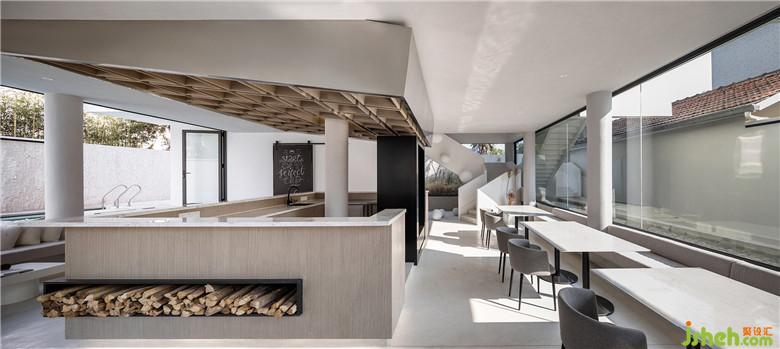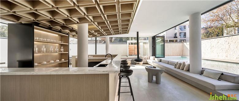 廳內(nèi)下沉的卡坐與泳池的水平線平齊,客人們可以在這里邊品酒邊與泳池里的人們聊天,此刻空間的邊界被消除,時(shí)間被放慢,只剩當(dāng)下這份令人心馳神往的愉悅。