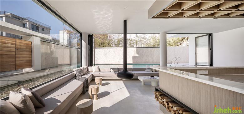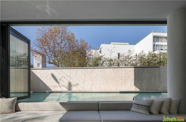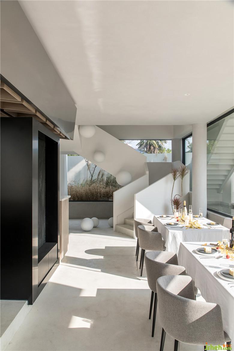 步入室內(nèi),將一層公共空間做了下沉處理,底層架空,通過柱子進(jìn)行支撐讓墻體解放,猶如一根根樹干,空間瞬間變得通透、寬敞,四周大開窗的玻璃設(shè)計(jì)將景色引入室內(nèi),以景喻情,充滿了自然斑斕的色彩。