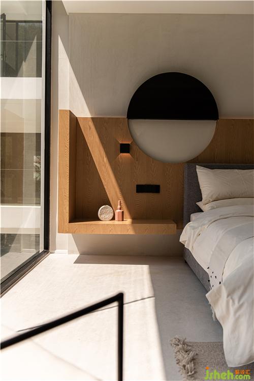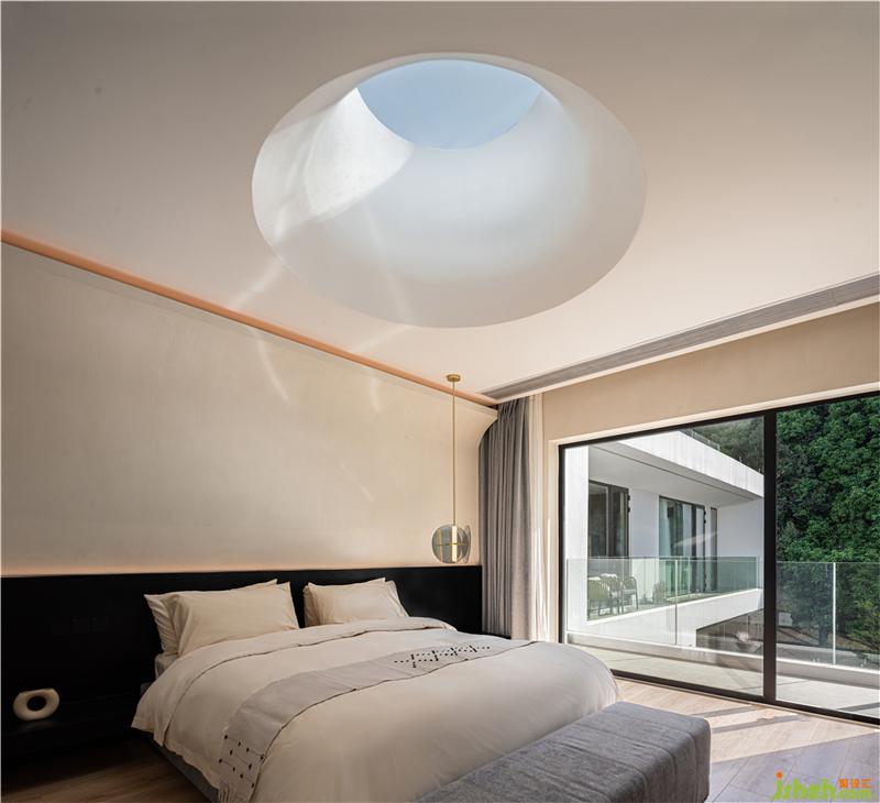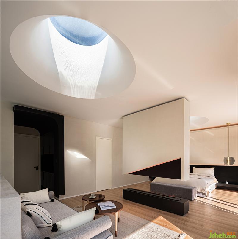 光通過開口的圓形天窗讓照入室內(nèi),光與影的交錯,仿佛與自然在對話。