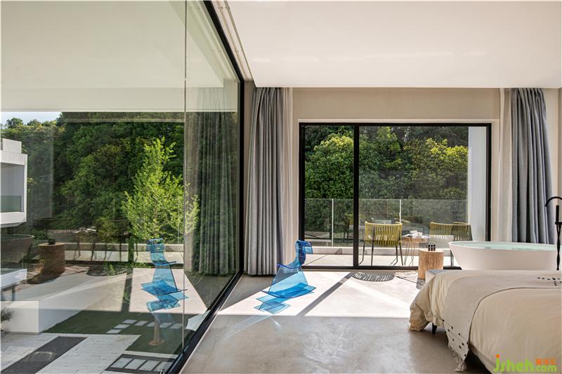 設(shè)計師希望每間房都能映出室外的風(fēng)景,房間有著270°落地玻璃窗,空間變得通透純凈。