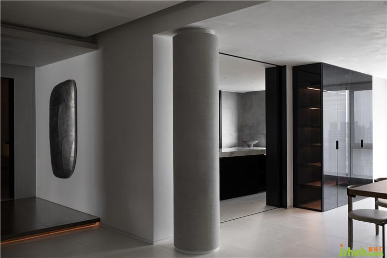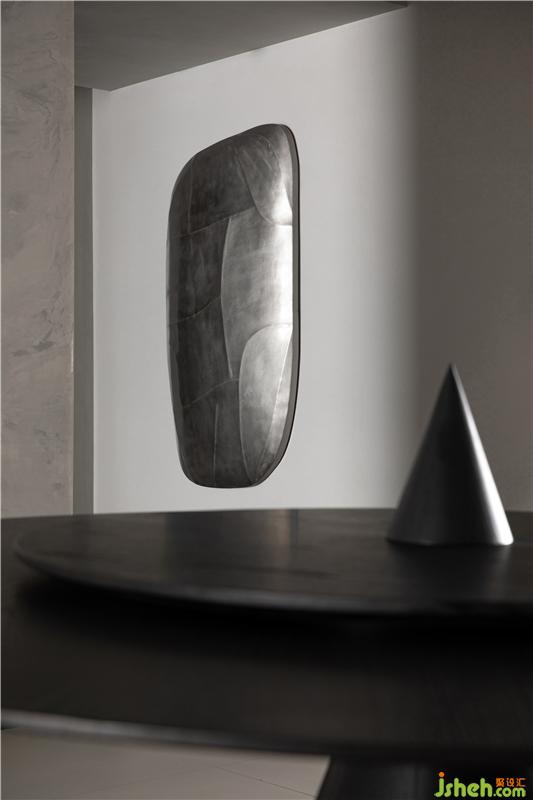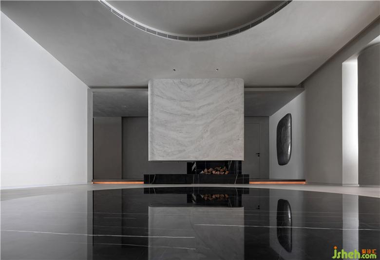 Use a modeling wall with storage function and fireplace function to distinguish the corridor and the dining area. The circular element on the top surface symbolizes the sky and the universe, echoes the ground, and integrates nature and space.