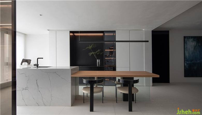 在原有格局基礎上,為了滿足主人不同的用餐需求,設計師劃分出一個西廚區(qū)域,灰色玻璃柜可以收藏酒品、餐具等。