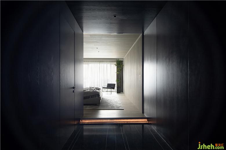 由于住宅內(nèi)沒有陽臺空間,設(shè)計師在臥室入口打造出一片入戶庭院,黑色“木盒子”將四周環(huán)境區(qū)分,鋪上一塊老石板,猶如在森林中穿梭。