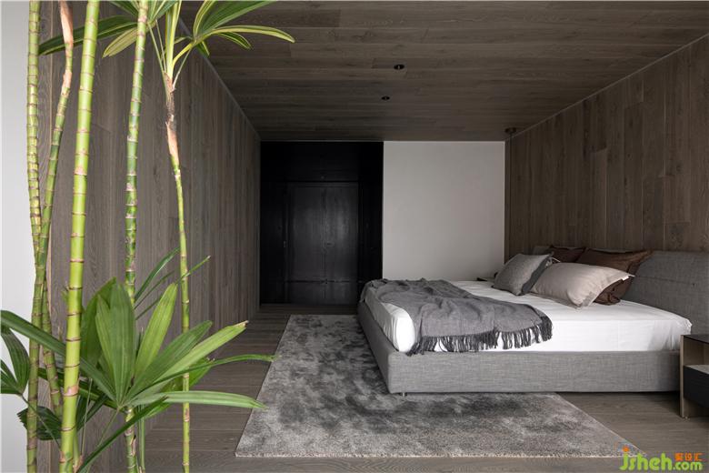 Since there is no balcony space in the house, the designer created a courtyard at the entrance of the bedroom. The black "wood box" distinguishes the surrounding environment and is covered with an old stone slab, just like walking through the forest.