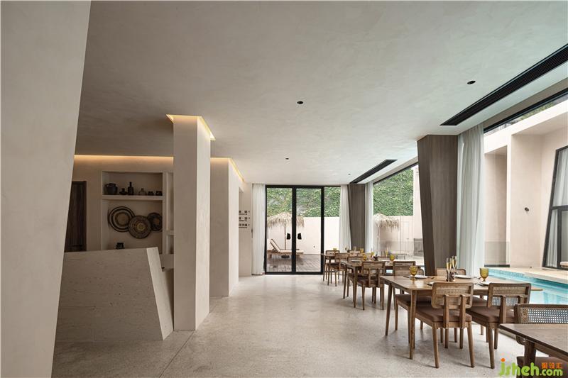 公共區(qū)域與餐廳進(jìn)行結(jié)合,透過落地玻璃可以看到星空泳池的全景。