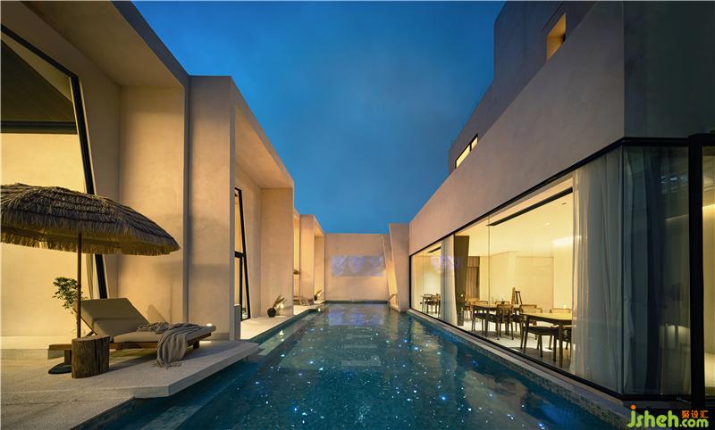 設(shè)計(jì)師希望客人可以從房間中直接躍入水中,時(shí)刻能與大海進(jìn)行互動(dòng)。因此在兩幢客房間建造了一個(gè)星空泳池,呼應(yīng)了“海天一色”的概念。