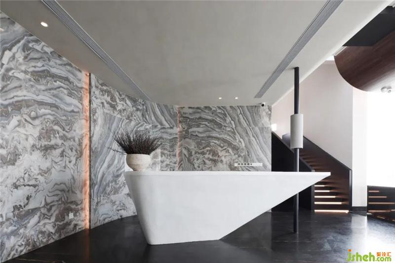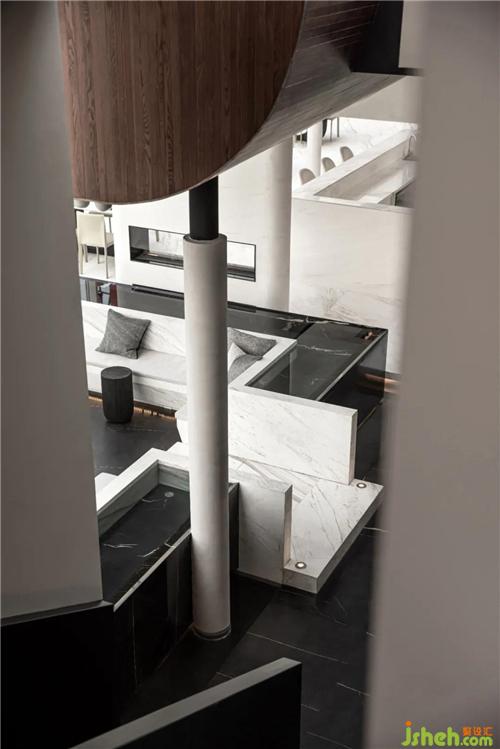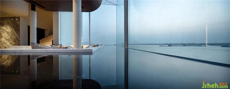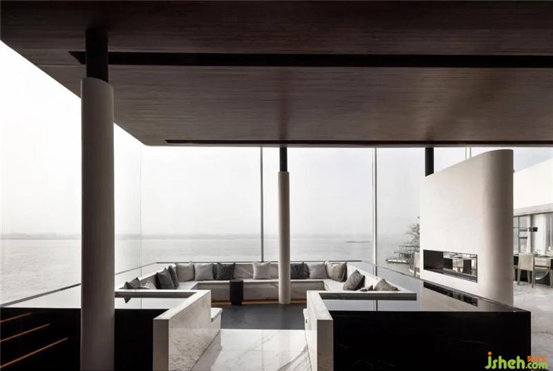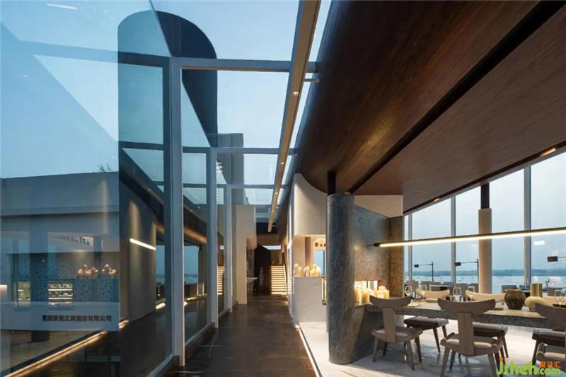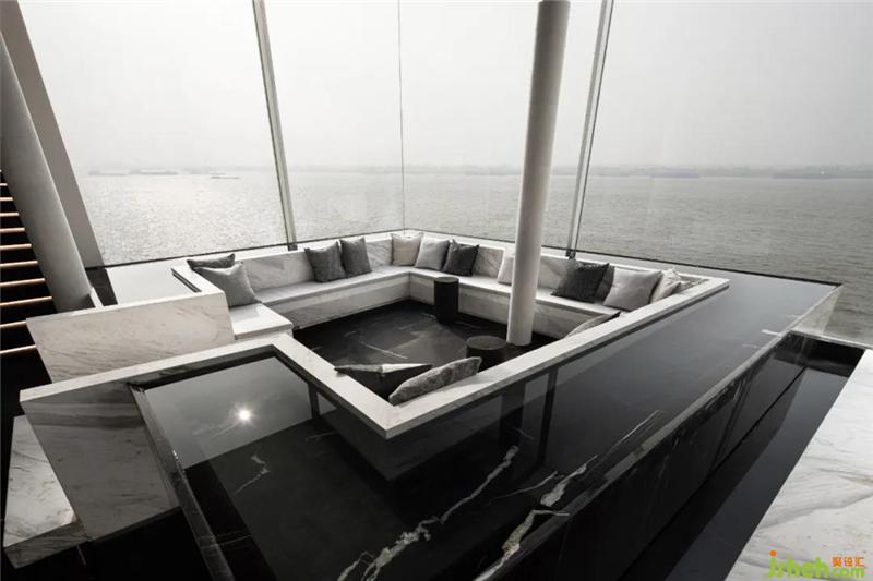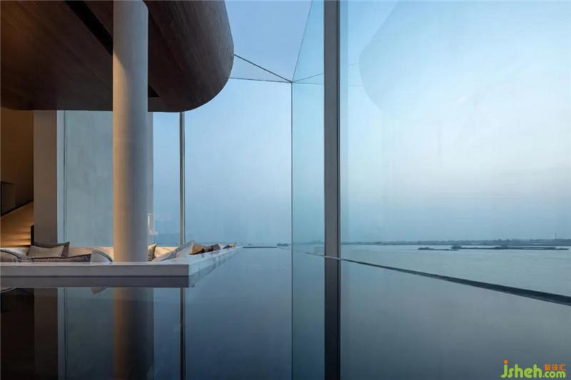 設(shè)計(jì)師為空間不斷注入新鮮感,在下沉?xí)蛷d周?chē)鹨黄鼐坝^,望向遠(yuǎn)處,水面無(wú)限延伸出空間外,與江水融為一體。
