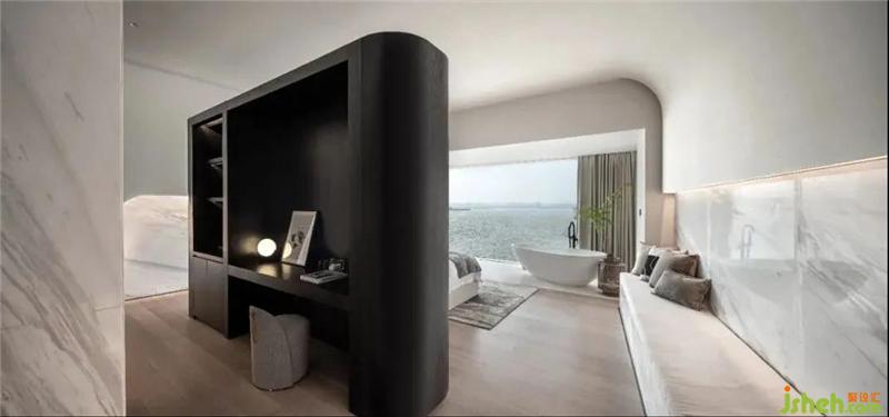 黑色盒子造型墻提取出集裝箱的概念,與原木色裝飾面做對(duì)比,在純凈的色彩之間,杭州酒店設(shè)計(jì)暖色的燈光與家具賦予空間以溫暖與自在。