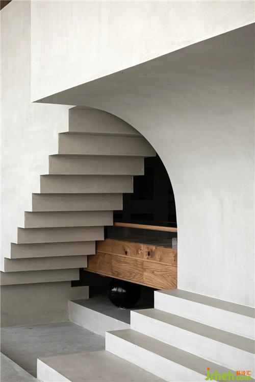 After observing the rolled-up state of ramie leaves, the designer integrated the arch structure into the space to add interesting points and shape sense to the space. The primary colors of wood and gray paint combine to create a plain tone, giving the color of nature.