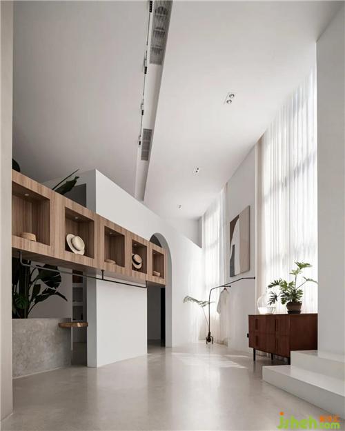 設(shè)計(jì)師在空間中鋪設(shè)層層臺階,不僅提升了造型感同時(shí)也能作為展示和休息的功能杭州店鋪設(shè)計(jì)。