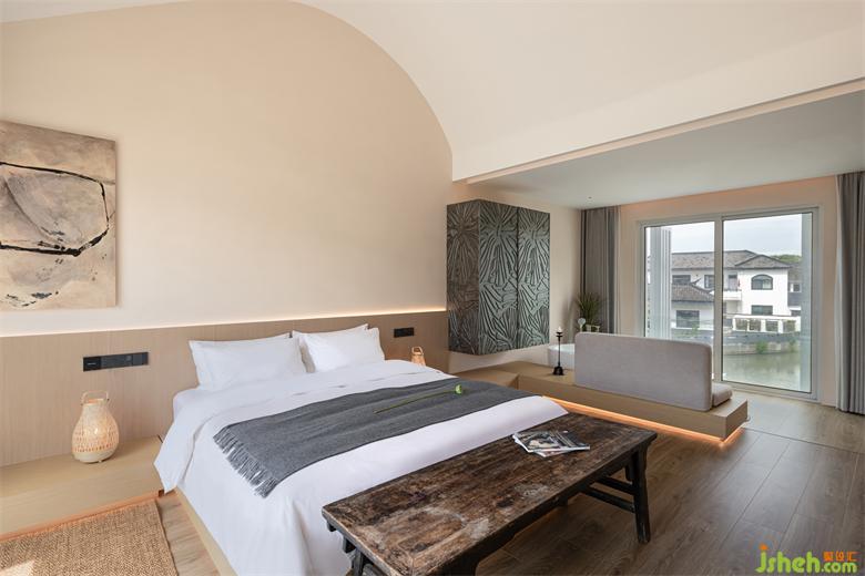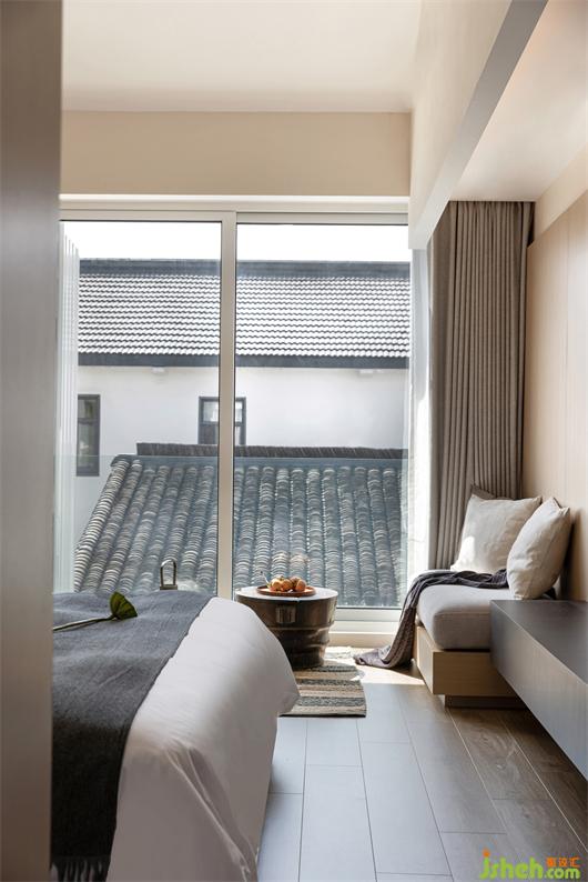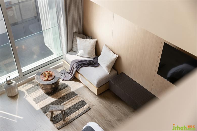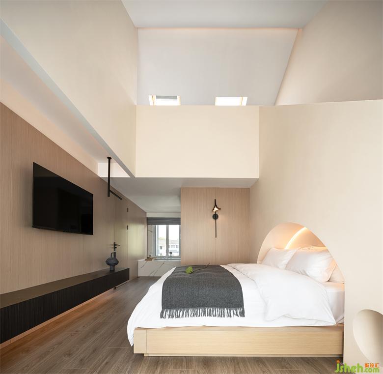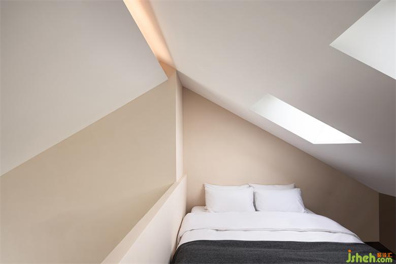 保留原本屋頂?shù)钠旅娼Y(jié)構(gòu),loft房間將空間每一處都利用到極致,燈光與空調(diào)藏入結(jié)構(gòu)中,最大化地讓空間變得極簡純粹。