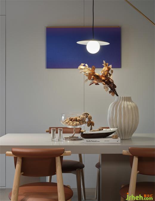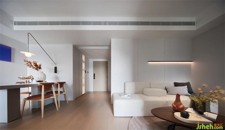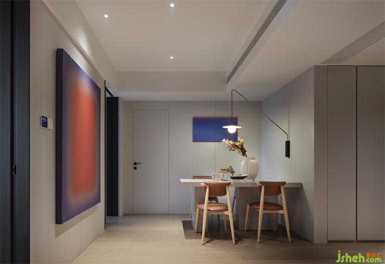 The special-shaped mirror surface in thedining room extends the longitudinal space, and the linear embedded magnetic track light combines beauty and function. The invisible door and the TV background wall are integrated into one, which makes the space pure and natural.