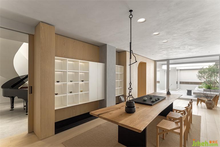 茶的禪意與哲學反映出主人的喜好與生活方式,臺州別墅設計師在茶室中保持著極簡與功能性,以木色體現空間氛圍,讓品茶融入生活,更是與自然產生對話。