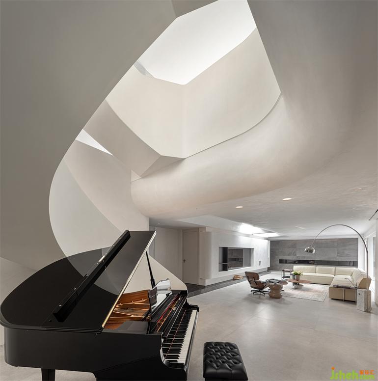 建筑讓空間承載了更多的包容性,頂部的拱形造型頂使空間變得更加開闊富有層次感,臺州別墅設(shè)計弧形的電視機(jī)墻結(jié)合壁爐讓一切看起來如此地舒適與和諧。