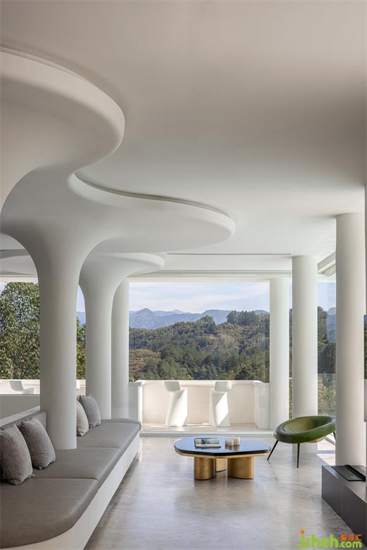 The wraparound rest area is surrounded by columns connected to the top, and the curved structure wraps the top surface of the shape, as if entering a forest. Floor-to-ceiling glass offers views of the lush landscape outside, blurring the boundary between the interior and the city.