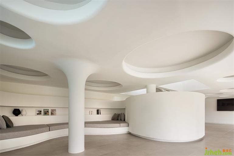 環(huán)繞式的休息區(qū)周圍分布著與頂部連接的立柱,弧形結(jié)構(gòu)包裹出造型頂面,猶如進(jìn)入了一片森林。透過(guò)落地玻璃可以望向室外郁郁蔥蔥的風(fēng)景,模糊了室內(nèi)與市外的邊界。
