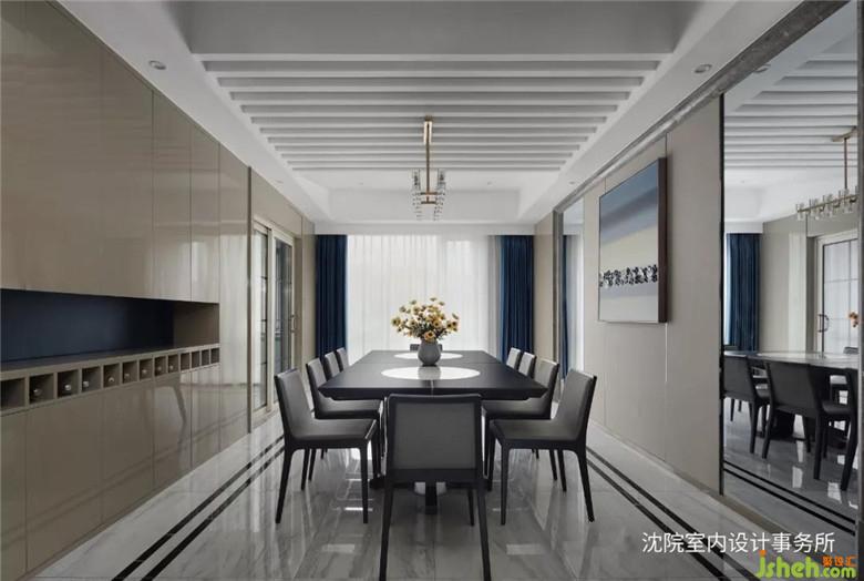 整面落地窗的設(shè)計使獨墅湖景一覽無余,藍色窗簾和圓桌的點綴搭配更使家于景相互融合,圓形金屬水晶燈凸顯整體層次感。
