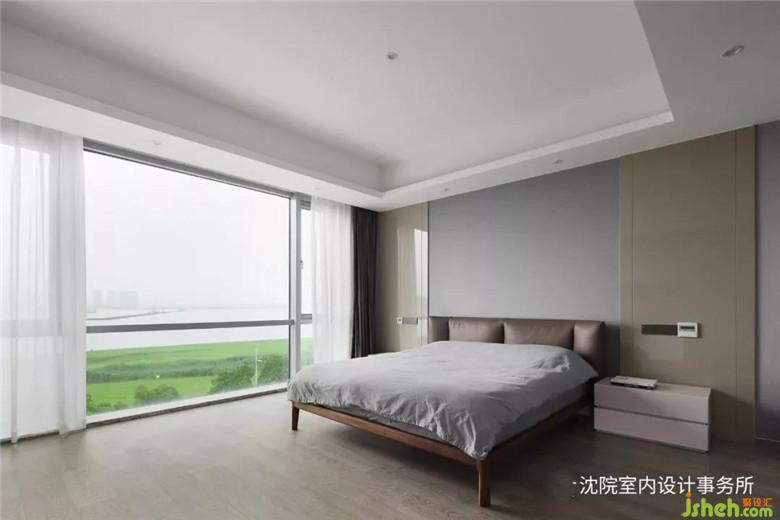 整面落地窗的設(shè)計使整體更加具有空間感,藍色背景墻與藍色沙發(fā)椅搭配空間,與窗外的湖景相互輝映。