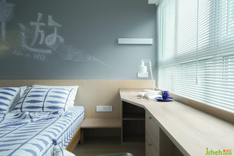 床頭是黑板墻,可以用無塵粉筆上面寫寫畫畫,床頭靠背是現(xiàn)場做的,可以發(fā)光,適合晚上打開窗邊是定制的寫字臺,因?yàn)榫嚯x的原因做了不規(guī)則處理床頭柜是用的隔板,更符合整體氛圍整體空間也是做的無主燈設(shè)計(jì),壁燈+筒燈的處理,可以讓空間更簡單