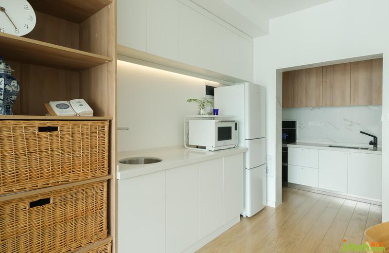 收納是這個家不變的主題,主人信奉‘?dāng)嗌犭x’的生活態(tài)度,半開放的廚房將西廚空間為之融合西廚的小盆子可以做一些沙拉,解決一些簡單的食物處理工作操作臺簡潔不冗余,是一定要實(shí)現(xiàn)的廚房生活美學(xué)