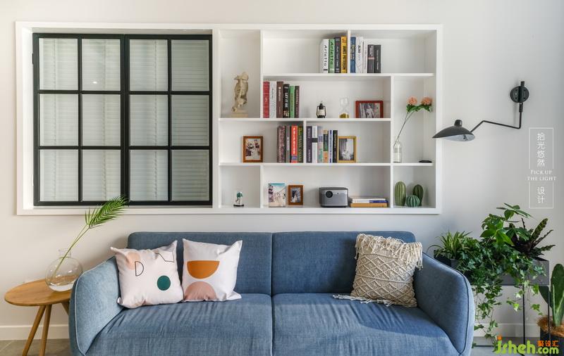 沙發(fā)背景墻的一邊是鋁合金邊框噴黑色氟碳漆窗扇,它還構(gòu)成了一個有意思的生活伏筆,另一邊是現(xiàn)場做的裝飾架,可以放下有關(guān)家人的珍貴瞬間