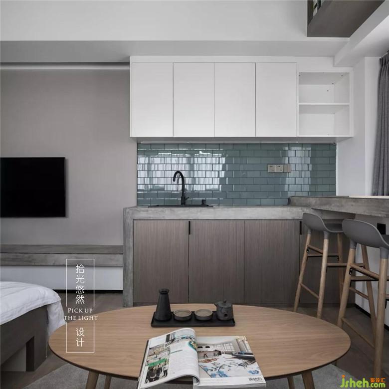 櫥柜里有嵌入式冰箱,餓了的時(shí)候可以用電磁爐做輕烹飪,煮面條下餃子或者蔬菜沙拉,可以坐在吧臺(tái)上就餐,走神,天馬行空。