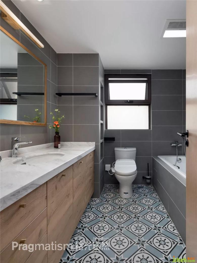 通過空間改造做出浴缸區(qū)域,地面拼接花磚讓簡約的浴室不簡單。裝修公司