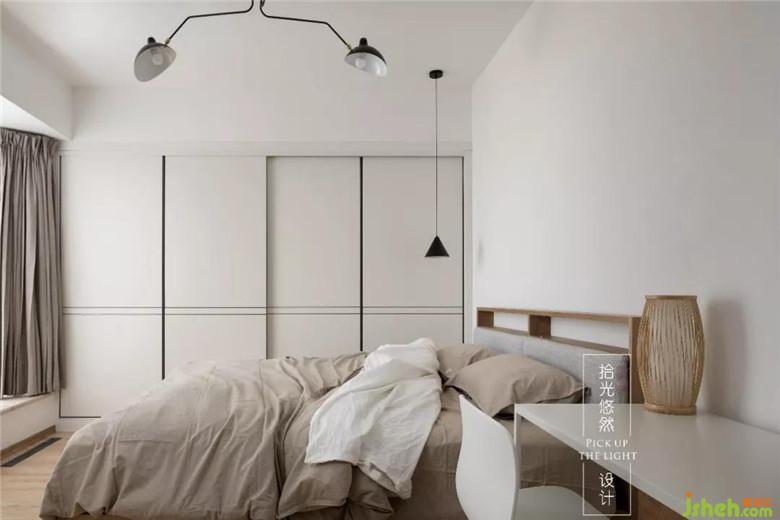 原本二樓是三間布局不合理的臥室,改造以后,變成一個包含衣帽間、書房和主衛(wèi)的超級主臥,臥室簡單素雅,用重色小小點綴,燈的顏色和材質(zhì)豐富了空間觀感