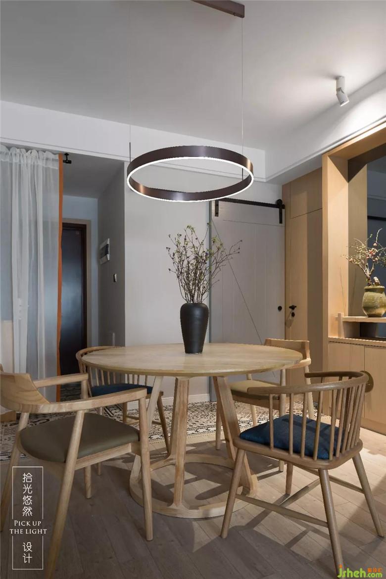 平時(shí)就兩個(gè)人就餐,圓桌的設(shè)計(jì)讓動(dòng)線更柔和與靈動(dòng),因?yàn)榕P室門與衛(wèi)生門都在一個(gè)平面上,所以整體采用現(xiàn)場(chǎng)制作隱形門的方式,廚房門采用谷倉門的設(shè)計(jì)