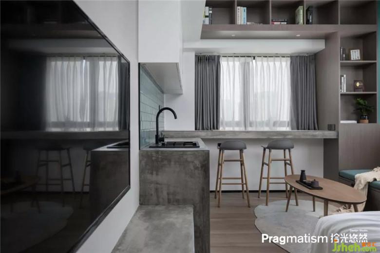 櫥柜里有嵌入式冰箱,餓了的時(shí)候可以用電磁爐做輕烹飪,煮面條下餃子或者蔬菜沙拉,可以坐在吧臺上就餐,走神,天馬行空。