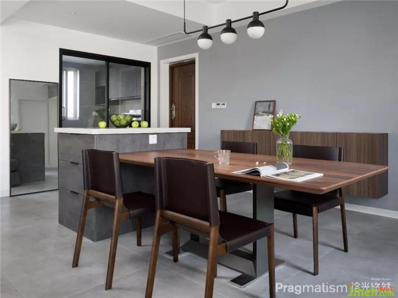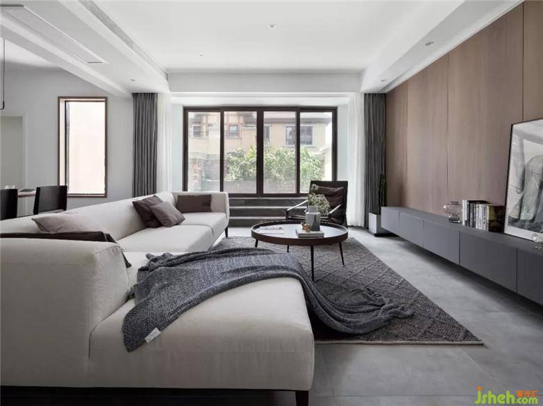 客廳采用的是木飾面與水泥板打造低調慵懶的氛圍,電視櫃定制懸掛,更現(xiàn)代極簡。