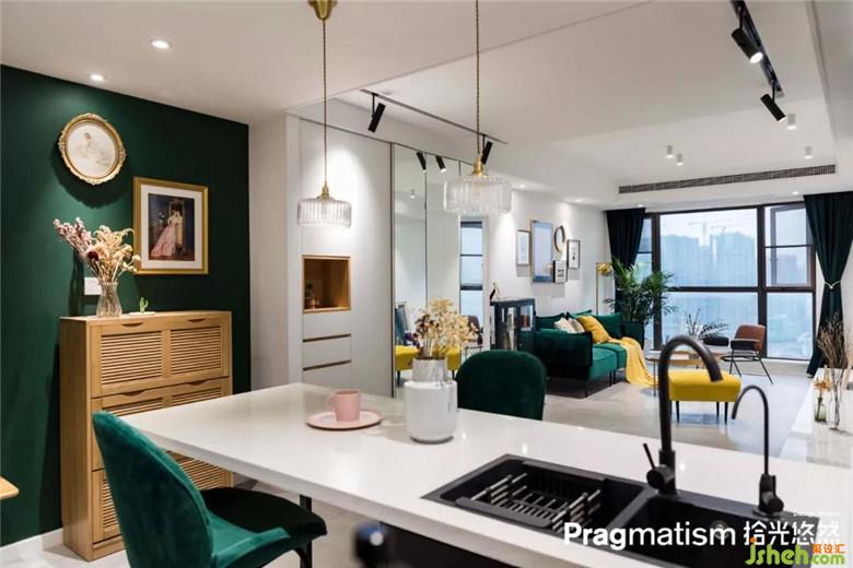 這抹綠繼續(xù)延續(xù)到餐廚區(qū),溫暖柔軟的天鵝絨餐邊椅,緩解墻體的硬朗感,用濃妝淡抹總相宜來(lái)形容在合適不過(guò)了。