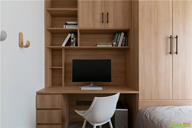 從改造上,采用榻榻米的形式壓縮空間,增加衣物空間的收納,作為偶爾留宿使用。書桌和書柜提供了業(yè)主一個隱私的工作與休閑的場所。