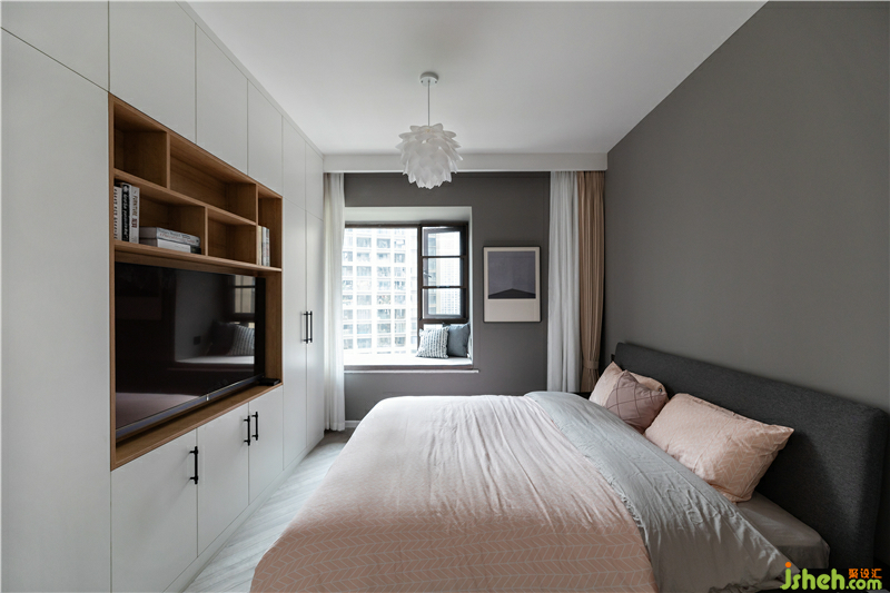主臥主要是業(yè)主父母居住,一是有較大的儲物收納需求,二是需要一個單獨(dú)看電視娛樂的空間需求。