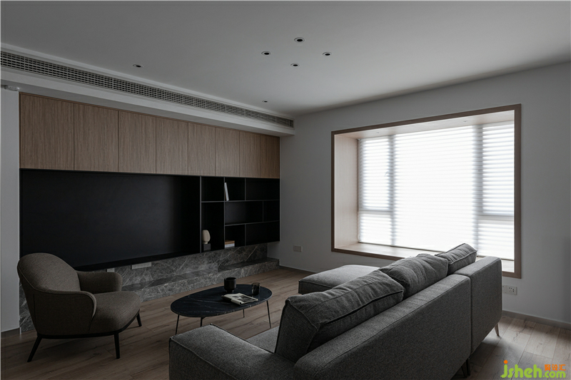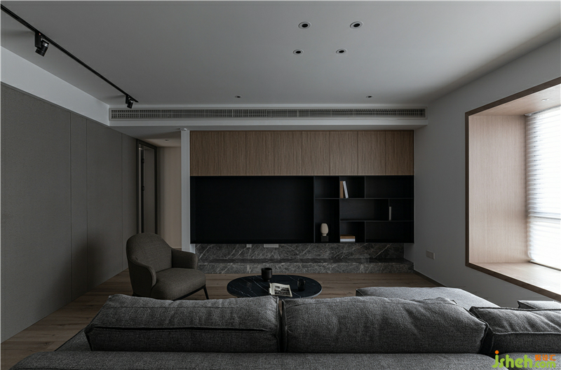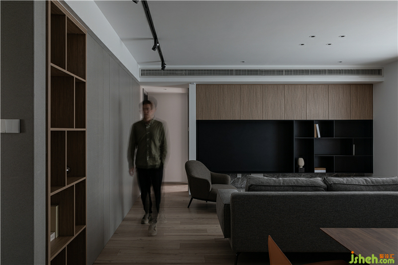 屋主喜歡比較暗黑、穩(wěn)重的調(diào)性,無論是背景墻還是客廳+老人房的公用墻,都做了置物架,方便未來屋主展示他們的收藏和書籍。裝修設(shè)計(jì)