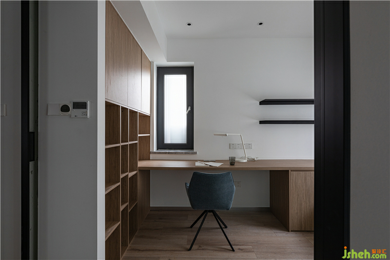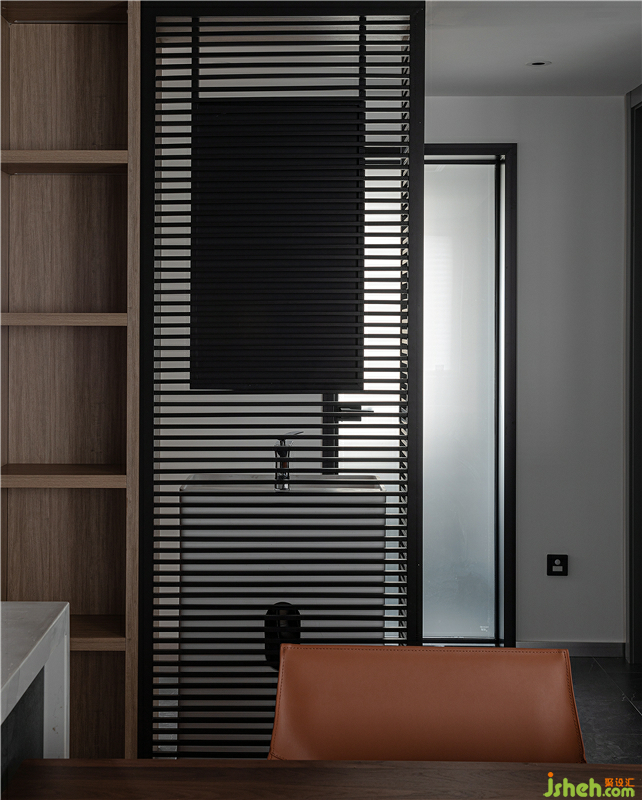 書房則設(shè)計(jì)了兩側(cè)極窄黑邊框推拉門,變成即可以獨(dú)立也可以開放的辦公間閱讀室。在制作這套推拉門時設(shè)計(jì)師與施工執(zhí)行師特別研究了許多相關(guān)資料,在施工時,推拉軌道需要提前安裝預(yù)埋件,安裝完成的效果門可以“隱藏”進(jìn)墻體內(nèi)。